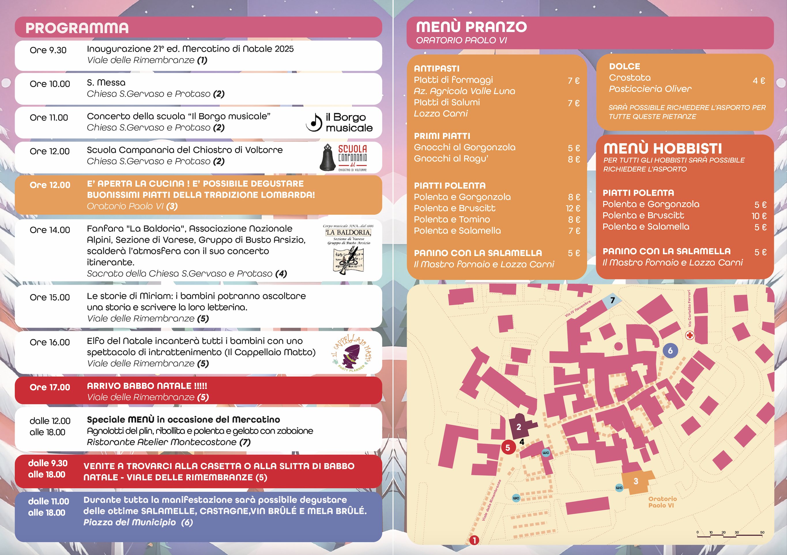 Per chi desidera una pausa gustosa, sarà possibile pranzare in oratorio, dove verranno servite tante prelibatezze.🍝🍖Durante tutta la giornata, ci si potrà inoltre scaldare con vin brûlé, castagne e salamelle, immersi in un’atmosfera di festa e convivialità. 🌰🍷